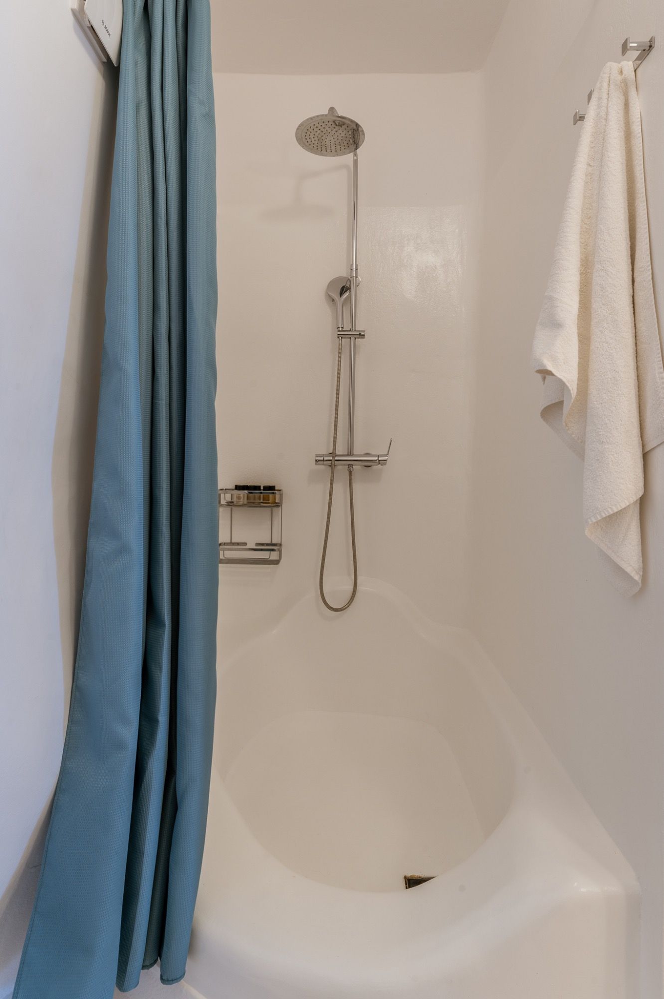Private bathroom. One room with WC, large shower, stone washbasin, hairdryer and complementary set.